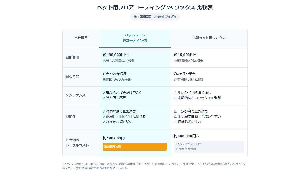 しかし、例えばペット用の滑り止めワックスを年に数回 (1回1~2万円) 塗り直す手間とコスト